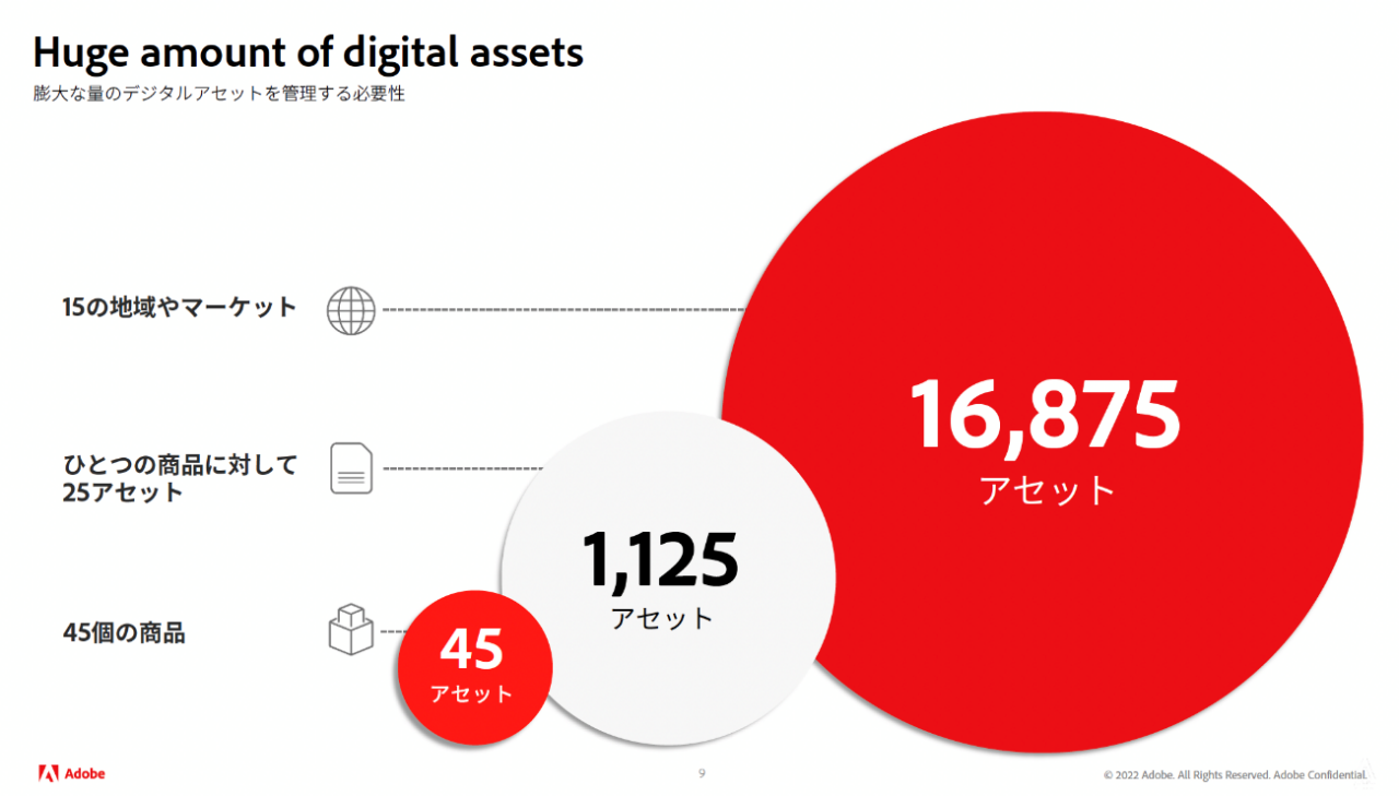 これらのデジタルアセットをもとに、顧客ごとにパーソナライズしたコンテンツを作成し、さまざまなチャネルに配信するとなると、いったいどれぐらいの数になるのか、想像できません。この膨大なデジタルアセットとコンテンツをどのように管理していくかが、1つの課題になります。