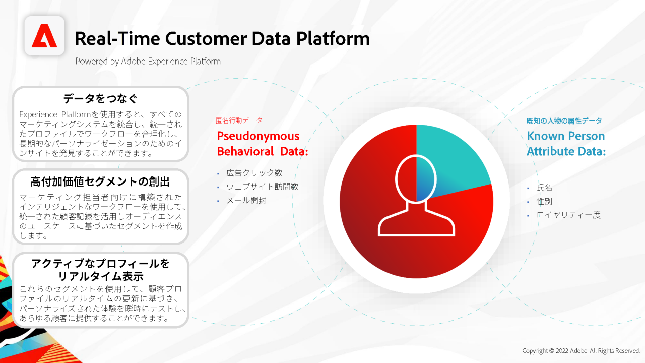 Adobe Experience Platformは、顧客体験の管理に特化した、業界初のデジタル基盤です[3]。あらゆるデータを顧客プロファイルに変換し、常に適切な顧客体験を提供可能にします。