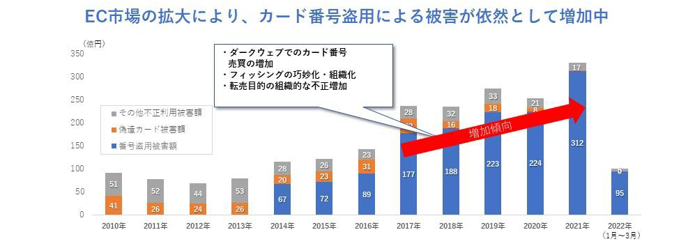 栗坂 : 急増しています。日本クレジット協会の調査[1]によると、2021年の不正利用被害額は約330億円。その中でも特に、番号盗用被害額(グラフ青)、すなわちクレジットカード番号の盗用による不正被害が著しく増えている状況です。