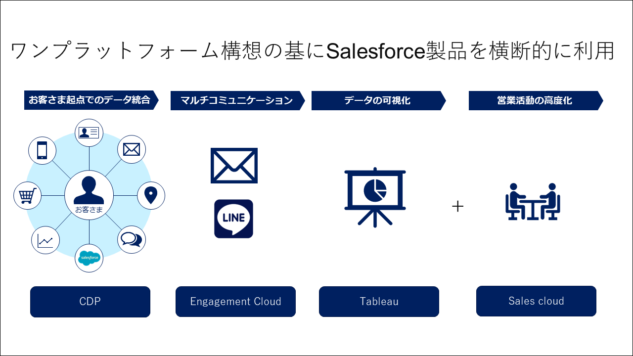 矢内(電通デジタル):電通デジタルでは元々、霧島酒造様のDX推進事務局が実施されていた講演会にも複数回、登壇させていただきました。今回霧島酒造様はSalesforceのCDP以外にも「Marketing Cloud」「Sales Cloud」「Tableau」を導入されましたが、当社はそれらのプラットフォームの選定から、製品を使って何をしていくべきかを策定し、導入時に必要な開発、構築、運用までを一気通貫でサポートしています。