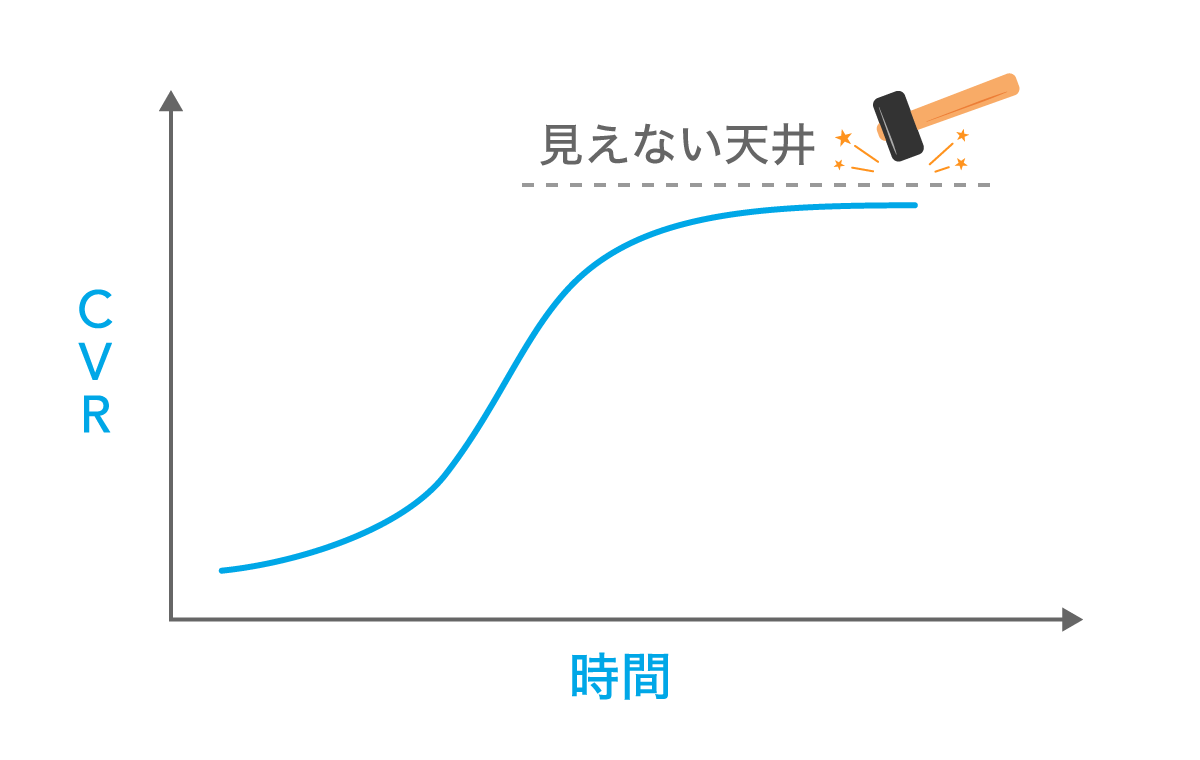 一般に、WebサイトのCVRには「見えない天井」と呼ばれる上限値があります。CROを開始した当初、CVRは高い伸び率を示しますが、徐々に伸び率が下がり、ある時点で頭打ちとなります。