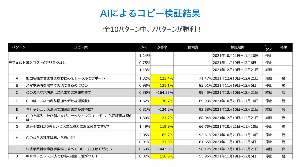 デフォルトのキャッチコピーをA案、コピー生成AIが作成したキャッチコピーをB案とし、順次A/Bテストを実施しました。結果は以下の表のとおり、AIで生成したコピー10個のうち、7個がデフォルトに勝利しました。