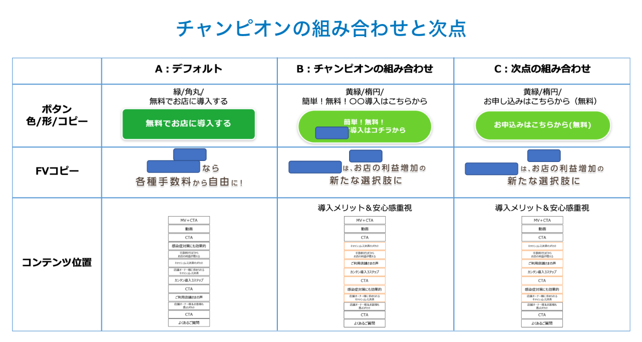 チャンピオンを組み合わせると、本当にCVRがもっとも高くなるのか、最終的に判断するために、以下の3パターンで最終検証を行いました。