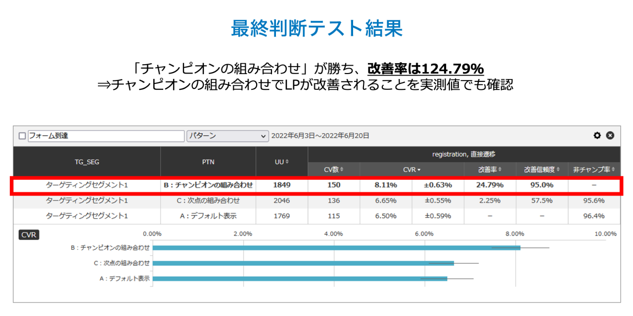 結果は、「チャンピオンの組み合わせ」のCVR改善率が124.79%と、もっとも高い数値となりました。