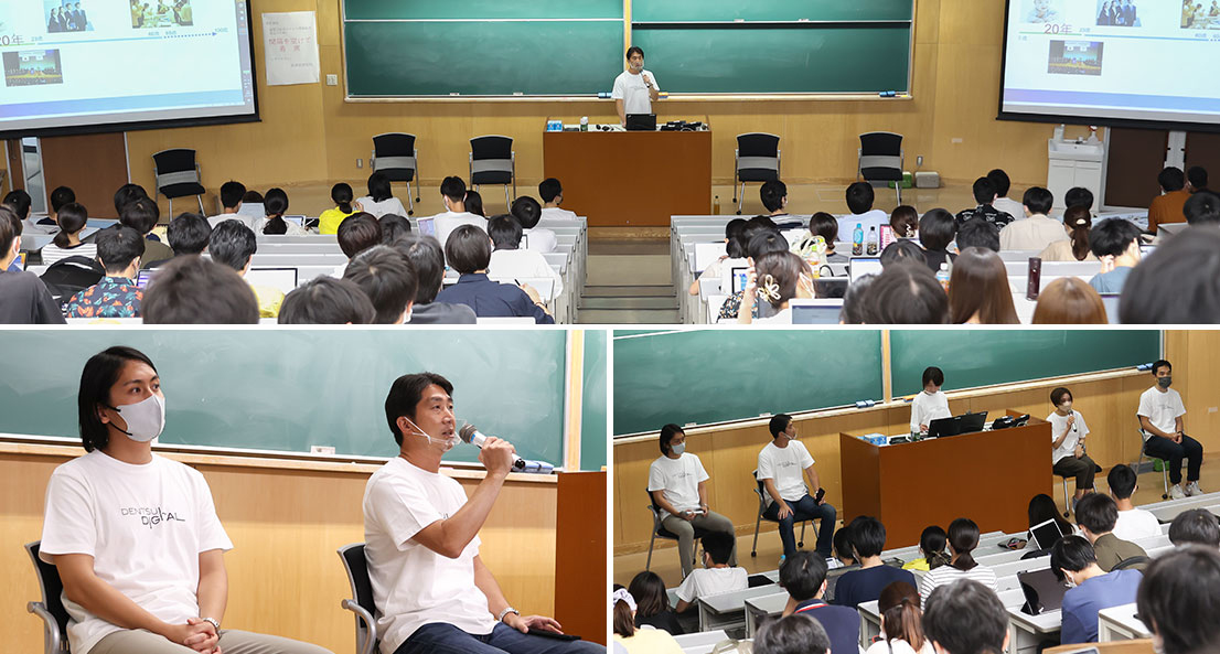 15回目の講義では、電通デジタルの役員と共に大阪大学OBOGの若手社員が登壇。学生たちの質問に答える形で、DX領域におけるキャリアの創り方や電通デジタルで働く意義などについて語った。教える側も教わる側も共に学べる貴重な体験ができたという
