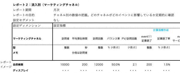 アウトプットのイメージはマーケティング部門内で作成するものなので、きっちりきれいに作る必要はありません。使い慣れたExcelでディメンションと指標の組み合わせを検討し、知りたいこと、定量的に確認していきたいデータ集計結果の見取り図を作り上げていきます。