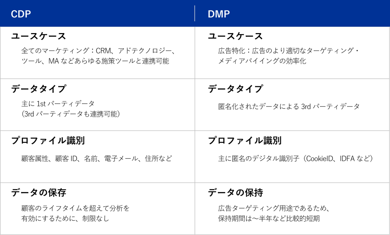 小林 : DMPはマーケティング担当者が広告をより効率的にターゲティングすることを目的に、発展してきました。その中身は、あくまで匿名情報で、個々のユーザーを識別することはできません。 一方でCDPは、氏名やメールアドレスなど顧客情報も含めて一元管理ができます。