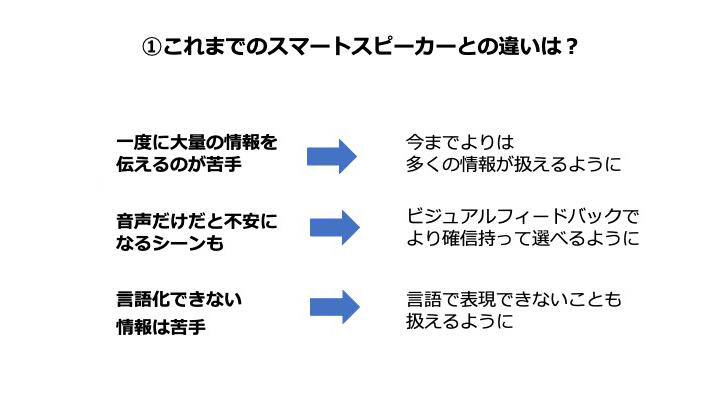 泰良は、現状のボイスだけのスマートスピーカーで困った例を挙げました。「『新橋の美味しい焼き肉屋さんを教えて』と呼びかけても、店名をズラッと並べられてしまう。美味しさが伝わらないし、人間の短期的な記憶としても店名を覚えられないですよね。また日用品が切れて注文をすると『シャンプー500ミリリットルですね?』と言われ、メーカーや商品名がわからなくて困ったこともあります。画面が付くことで商品を選ぶことができ、飲食店ならば美味しいかどうかの判断がつくようになる。今後は利用者の経験が変わっていくでしょう」と述べました。