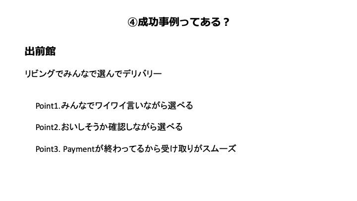 「出前館」は家族みんなで「ピザがいいね、お寿司がいいね」とワイワイ言いながら、自宅のリビングで食事をデリバリーするAmazon Alexaスキル。泰良は「子どもの友人が家に遊びに来ると使う」と言います。Amazon EchoからAmazonのタブレットであるFire HDやテレビに接続して、画面で選ぶことが可能です。意外とポイントが高いのが、3番目の「Payment(支払い)が終わってるから受け取りがスムーズ」な点。「子どもはデリバリーを頼むと玄関まで商品を取りに行きたがる」そうで、「楽なのは玄関でおつりのやり取りが発生しないこと」と語ります。