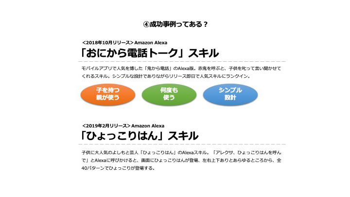 次に恩田氏による成功事例です。「今後はエンタメ系のコンテンツが、スマートスピーカーでは有利になる」と語る恩田氏が紹介したのは「おにから電話トーク」Amazon Alexaスキル。立ち上げると同時に鬼から電話がかかってくるシンプルな設計で、親の代わりに鬼が子どもを叱ってくれるものです。第1部で登壇した佐々木は「自宅で使っていますよ」、泰良は「ウチは禁止!子どもがすごく怖がってしまう。徐々に怖さが増していくから、うまく作り込まれている」と、パネラー陣も盛り上がりました。