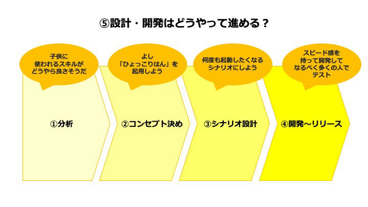 恩田氏は、上図の「③シナリオ設計」が1時間ほど、「④開発〜リリース」も半日ほどでできたと言います。「一番大変だったのは、ひょっこりはんの動画撮影でした。スケジュールを押さえて1ヵ月半待ち。トータル40カットを撮りました」と答え、会場も笑いに包まれます。