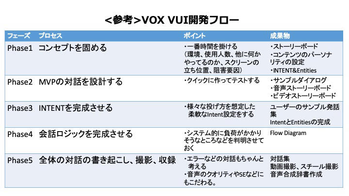 最後は、VUI開発の成功ポイント、失敗しがちな点について考えます。その前に泰良が「VOX VUI開発フロー」をまとめました。