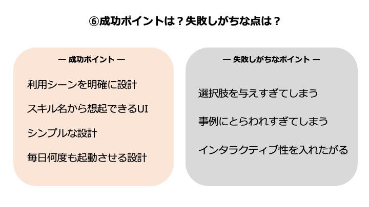 恩田氏は、泰良が上記に挙げた成功ポイントのほかに、ここ1年でスキル設計をして感じるところがあったと言います。それは「ユーザーの感じるコンテンツがダイレクトに出てくる設計。言い換えると、ユーザーが最短距離でコンテンツに近づけることが大事で、"会話は補足で充分"」とのこと。そこから失敗しがちなポイントの「インタラクティブ性を入れたがる」に言及します。