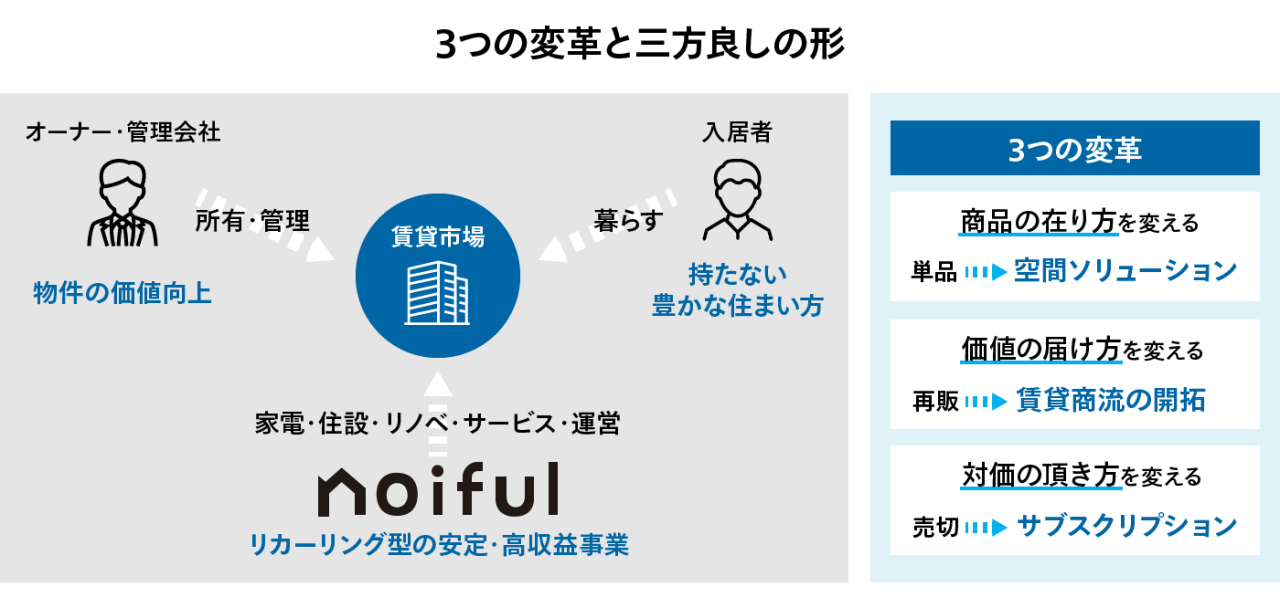 太田: noifulの事業ミッションとして、「持たない豊かなくらし方の提供を通じたくらしと社会への持続的な貢献」を掲げており、そのKSF(キーサクセスファクター:重要成功要因)が3つの循環型経済の実現です。1つ目は、ライフステージやライフスタイルの変化に合わせて、もっと気軽に移ろい住むことができる「くらしの循環」。2つ目は、空き家問題や老朽化物件の再生に寄与する「住まいの循環」、3つ目は家電のリユースやリサイクルによる「モノの循環」です。