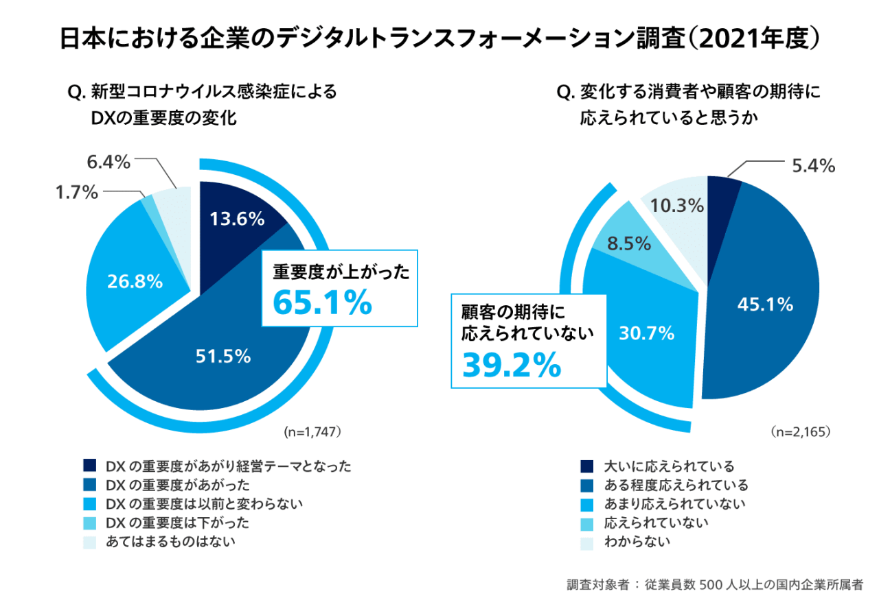 電通デジタル・安田裕美子(以下、安田): コロナ禍を契機に生活者の価値観や行動の変化が進み、DXが経営アジェンダ化しているのは間違いありませんが、企業はそのニーズに十分応えられていないのが現状です。電通デジタルで実施した「日本における企業のデジタルトランスフォーメーション調査(2021年度)」の結果でも、コロナ禍でDXの重要度が高まったと考える企業が65.1%を占める一方、変化する顧客の期待に応えられていないと感じている企業は39.2%にも上っており、"焦り"や"ジレンマ"が感じ取れます。