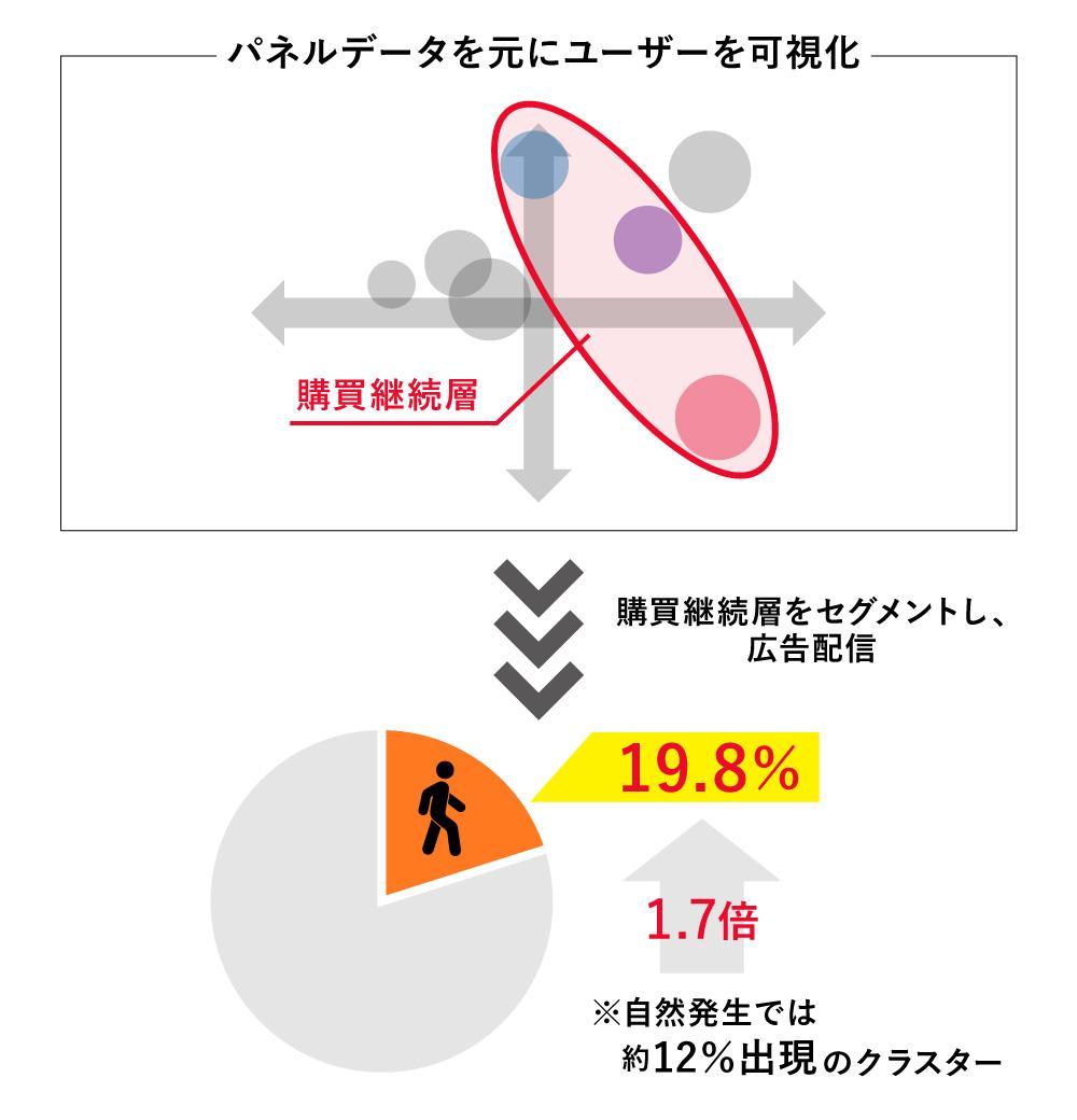 ある食品メーカーは四半期に1回、パネルデータを用いて、コロナ禍で外出機会が減り離脱したユーザーや、コロナ禍でも購買を継続しているユーザーを可視化し、それらユーザーの特徴をまず分析しました。その後、検証の結果、広告においては離脱した層でなく、継続した層により集中して投資したほうが効率的だと分かりました。そこで、LINEのデータクリーンルーム上で「Ponta会員」のID内に同じクラスタを再現させ、「購買継続層」をセグメントしてLINEで拡張を含めて広告配信を行った結果、第三者の調査では配信数に対する「購買継続層」の含有率を1.7倍ほどまで高めた例もあります。