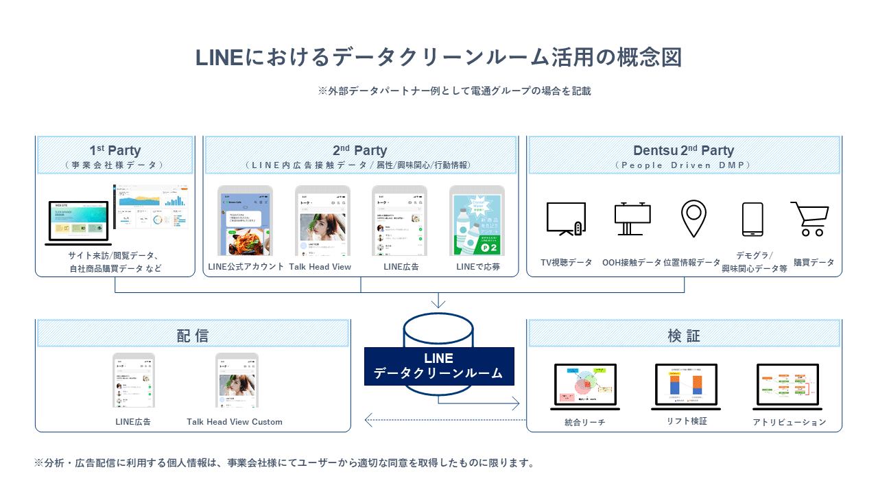 購買ログやアクセスログなどの広告主様が保有するデータと、外部のデータパートナー様が提供するサードパーティデータ、LINEグループが持つデータを、LINEの環境内で突合させ、活用できるデータ基盤です。