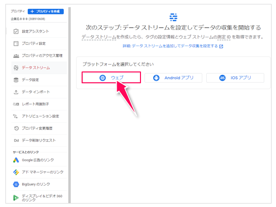 まずは計測を行う対象(プラットフォーム)の種別です。[ウェブ]を選択しましょう(アプリの場合は[Androidアプリ]か[iOSアプリ]を選択しますが、説明は省略します)。