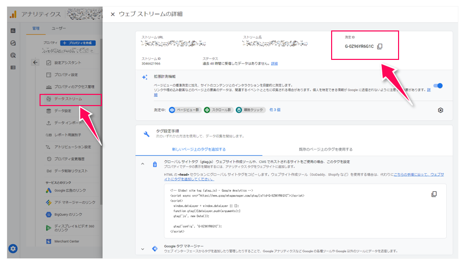 データストリームの画面に表示されている「測定ID」の右のアイコンをクリックすると、測定IDがクリップボードにコピーされます。どこかにコピペして保存しておいてください。次のGoogleタグマネージャー(以下、GTM)の設定に必要となります。GTMの設定もGA4で計測を開始するには必須です。