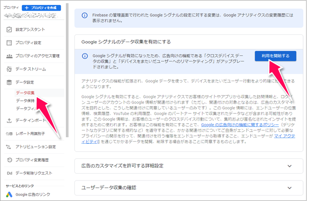 Googleシグナルの設定は、[プロパティ設定]>[データ設定]>[データ収集]で行います。