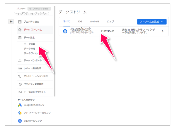 まずは、[管理]>[プロパティ設定]>[データストリーム]を開き、対象のデータストリームをクリックします。