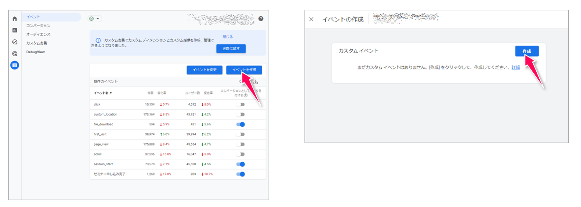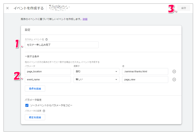 - カスタムイベント名:わかりやすい名前を入力(日本語可能。今回は「セミナー申し込み完了」)
