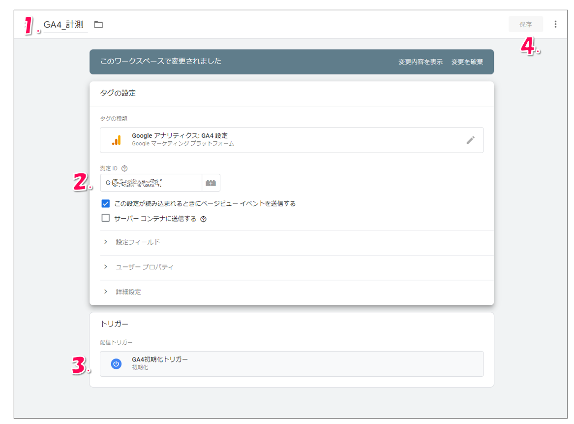 [タグの設定]をクリックして、タグの種類(タグタイプ)は「Google アナリティクス:GA4設定」を選択してください。次の画面では以下の手順で設定を行います。