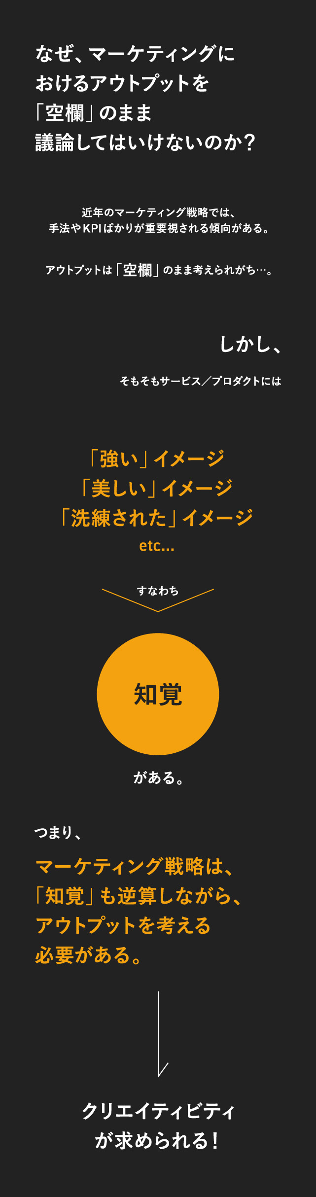 マーケティングが最終的に説得力に欠けてしまうのは、そのためであると。最後の質感の部分とも言える「知覚」をイメージしてビジネスを考える。そこに発揮されるものこそ、クリエイティビティなのだと思います。