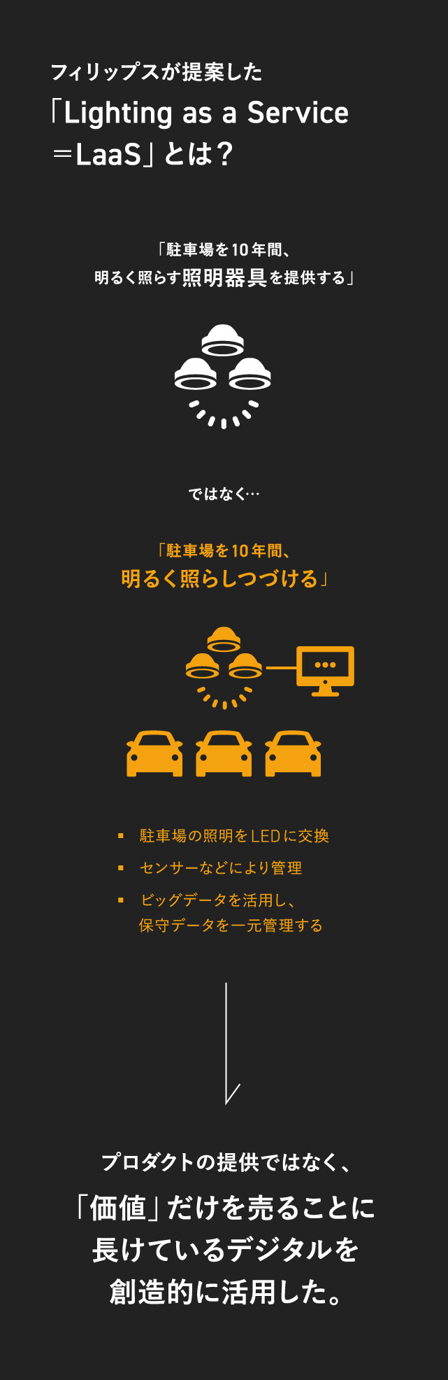 フィリップスは、米・ワシントンDCの公共駐車場25カ所の照明入れ替え案件において、照明機器そのものではなく、プロダクトとデジタルによるサービスとして「駐車場を10年間照らしつづける」という価値を売る提案をしました。