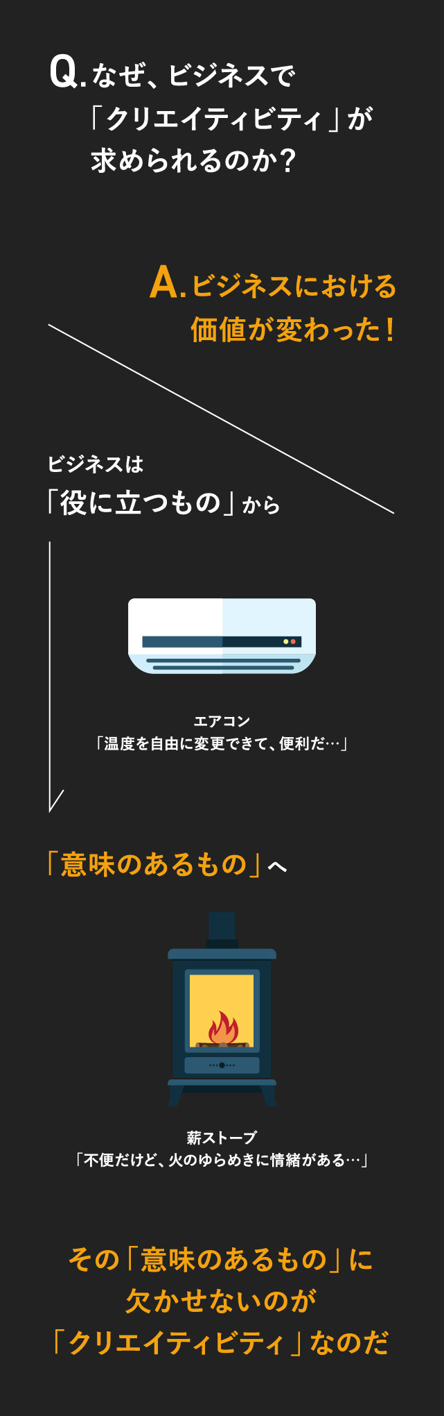 モノの「機能」よりも「意味」や「付加価値」が重視される時代では、クリエイティブの力が大きな後押しとなる。またクリエイティビティこそが、本質的な目的を捉え、低迷する日本企業の躍進のカギになるという声もある。
