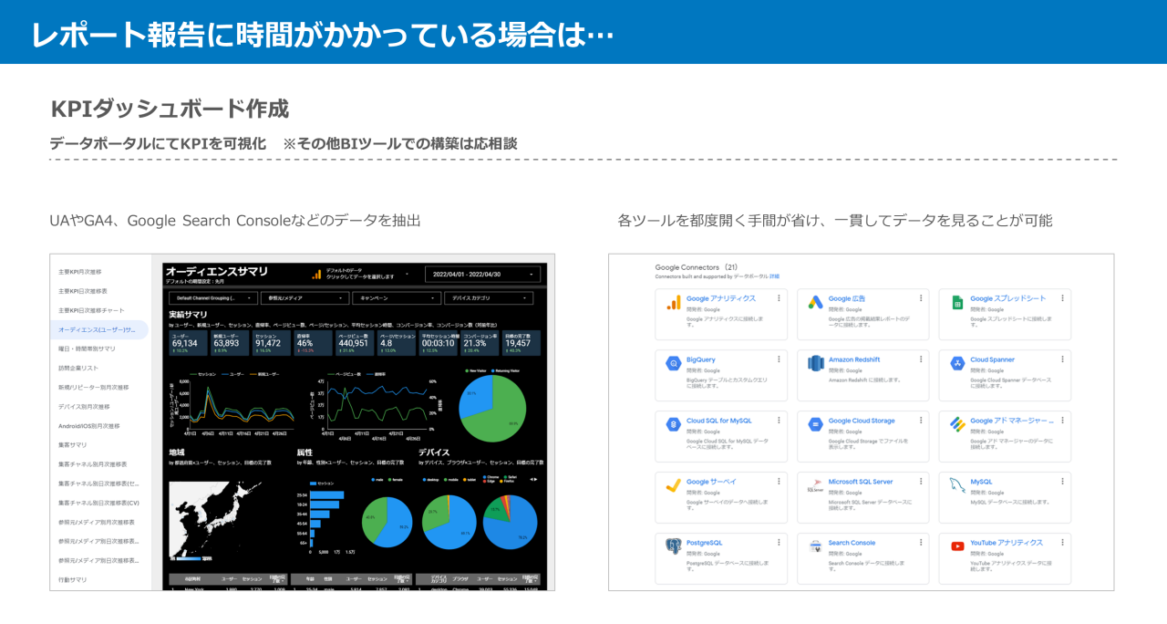 「GA4は導入したが、Webサイトの課題が見つけられない」といった方には、KPI設計書とレポートフォーマットの作成をご提案。レポートの活用についての助言も実施しています。