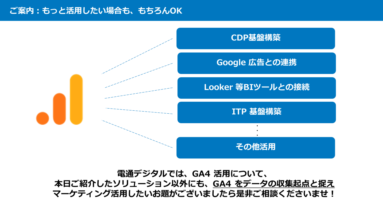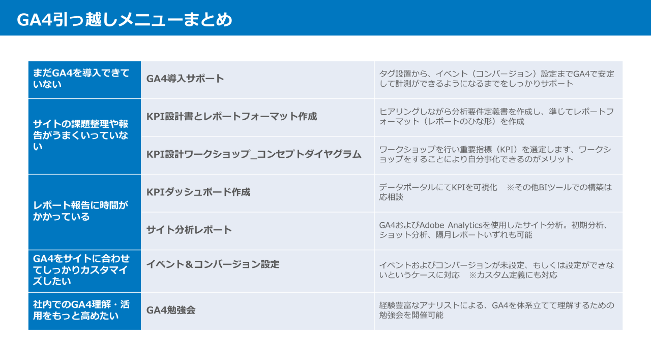 これら以外にも、「サイト分析レポート」や、「GA4勉強会」などのサービスも提供しています。UAからGA4への引っ越しに際して、これらのサービスの活用をご検討いただければ幸いです。