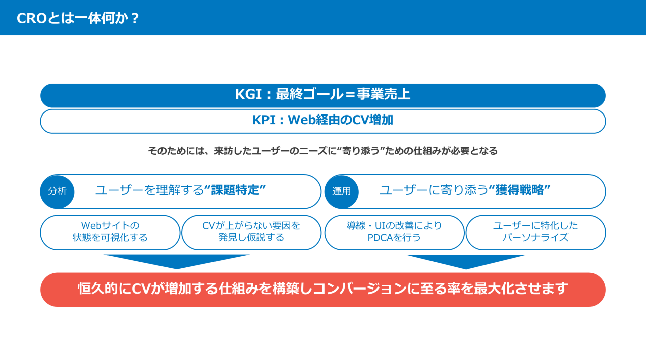 パフォーマンスを正しく計測することで、Webサイトに訪れる「ユーザーを知ること」や、製品・サービスへの「お問い合わせに至る率」を向上させるための問題や課題を発見することができます。Webサイトのコンバージョンやお問い合わせ、申し込みといったアクション向上の観点である、「CRO(Conversion Rate Optimization)」についてご紹介いたします。