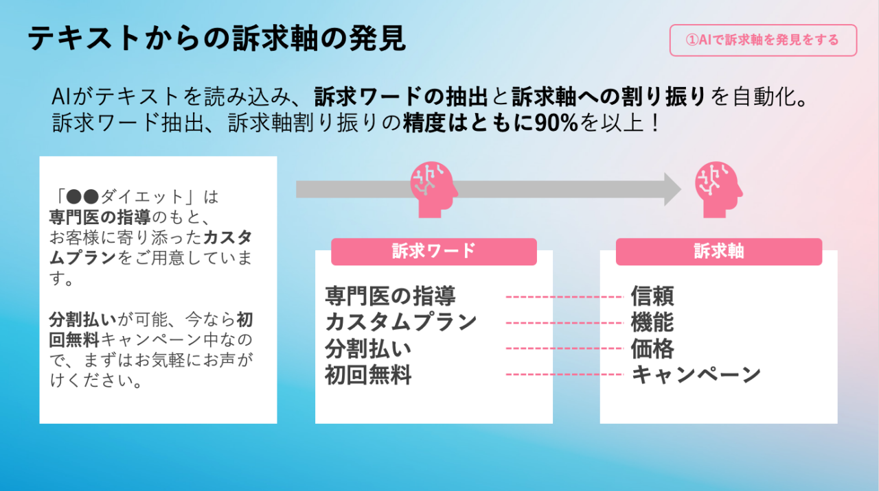 山本 : 「∞ AI(ムゲンエーアイ)」は、お客さまのビジネスを無限にグロースさせるためのAIソリューションです。AIがテキストを読み込み、訴求ワードの抽出と訴求軸への割り振りを自動で行ってくれます。クリエイターの発想や能力を拡張する「人に寄り添うAI」をコンセプトに開発しました。