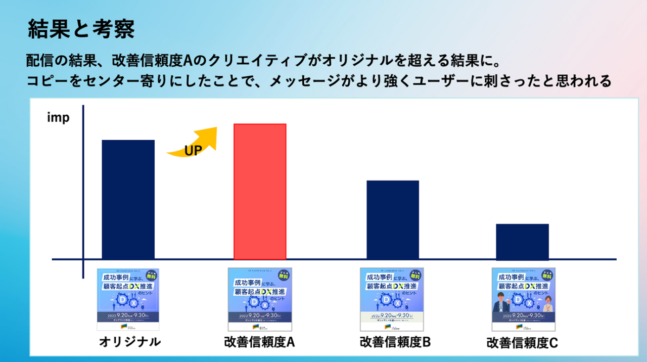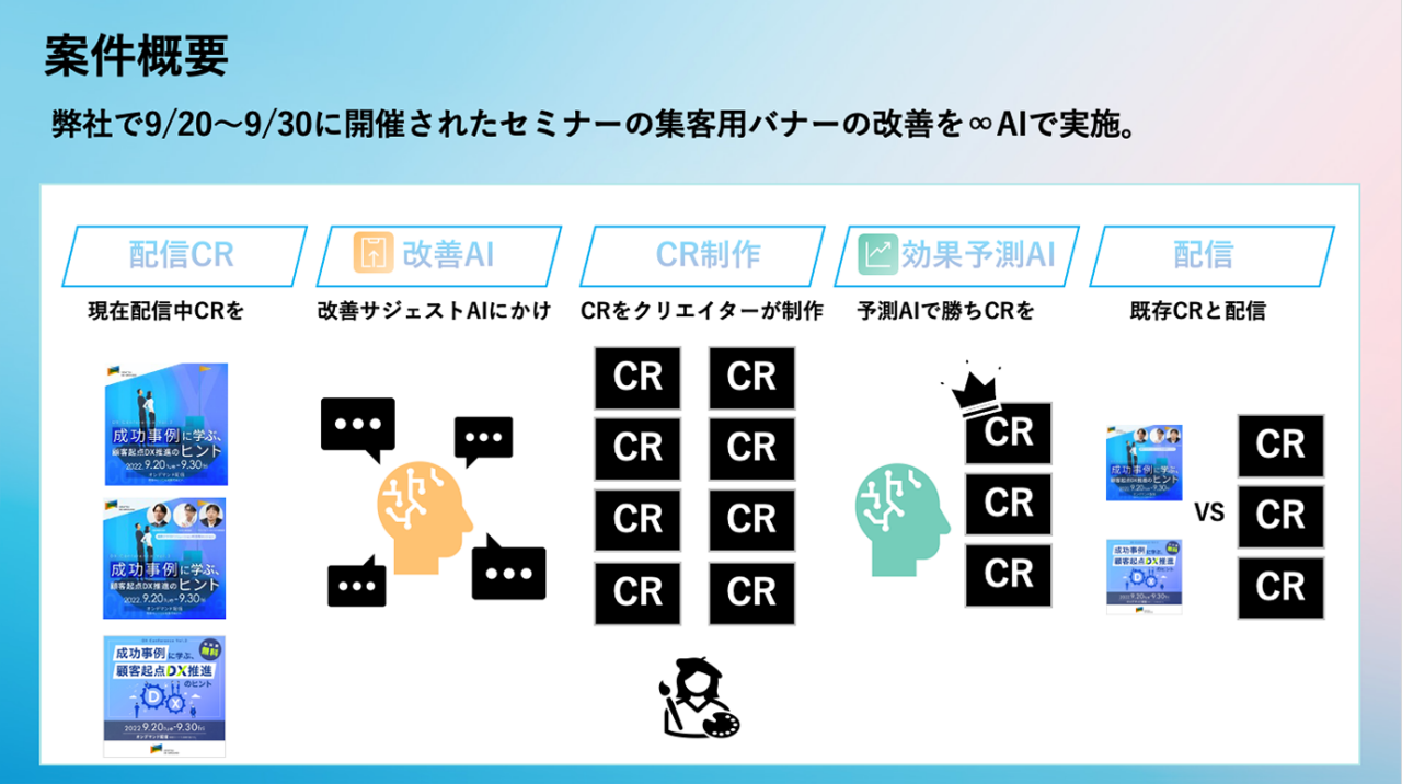 和田 : 本格提供前にいくつか先行事例を進めている途中ですが、「∞ AI(ムゲンエーアイ)」を使って社内セミナーの集客用バナーの改善を3週間にわたり実施しました。効果予測とサジェスト、そこから実際に制作するまでのPDCAをAIで回しています。