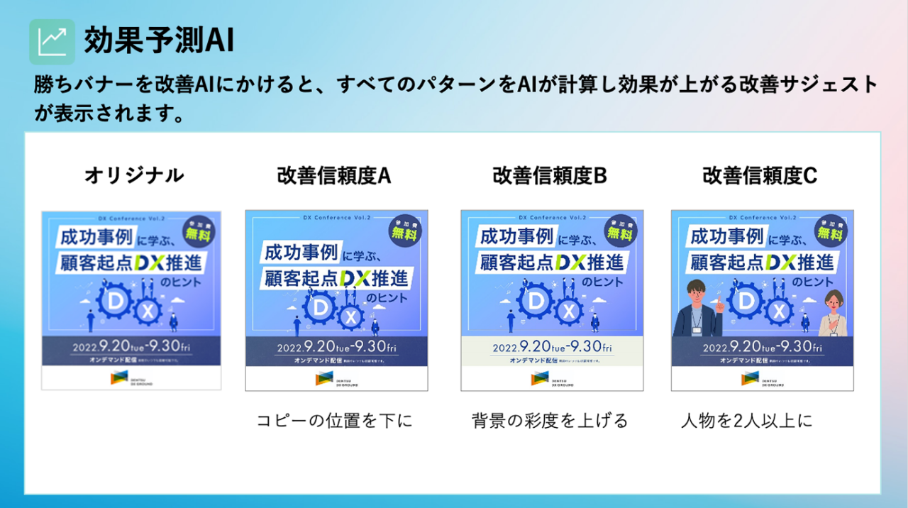 和田 : このようにオリジナルバナーを改善AIにかけることで、効果の高いクリエイティブのサジェストを行ってくれます。「コピーの位置を下にする」「背景の彩度を上げる」といったところまでAIが見てくれるのです。