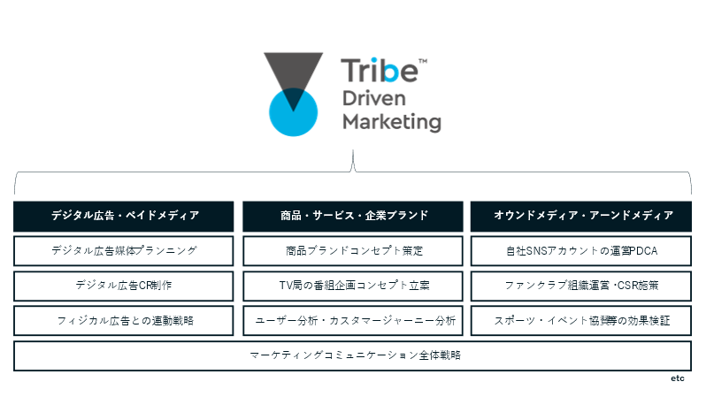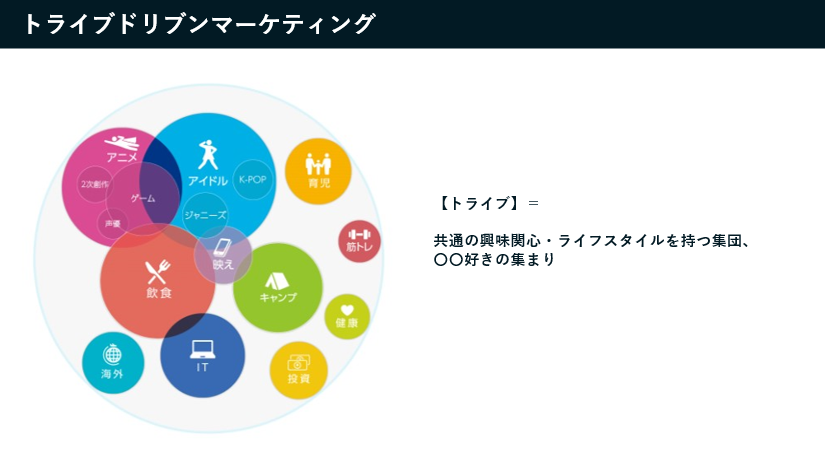 Tribe Driven Marketing とは、こうしたデータを基に共通の趣味嗜好・価値観で繋がり、情報交換しているユーザー群集団を“トライブ”として捉えて分析、アプローチする手法です。