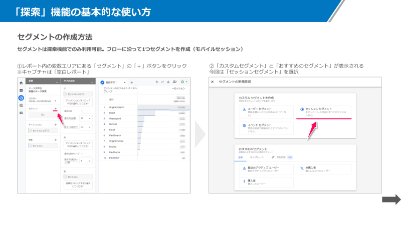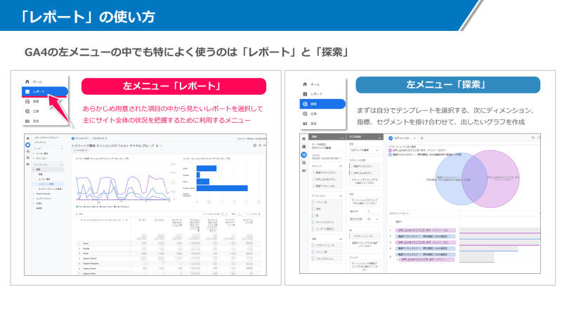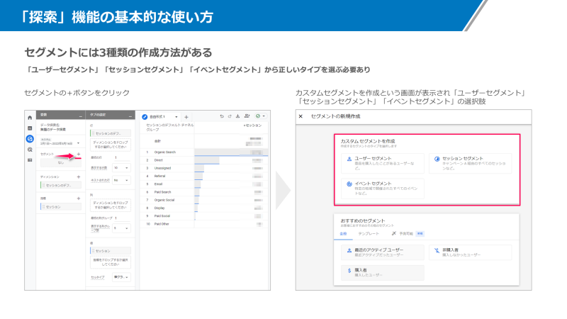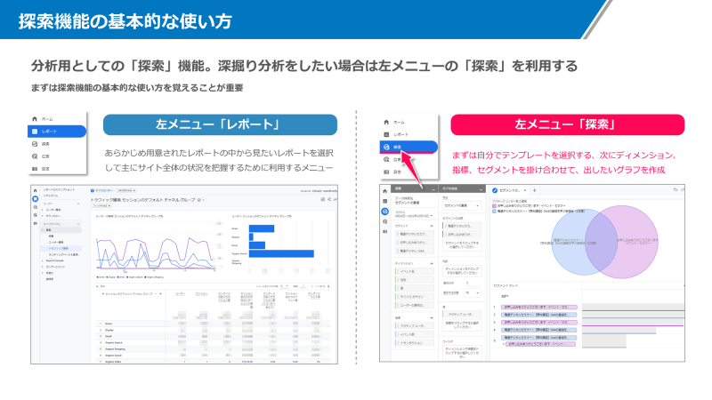 スライド右側が、「探索」です。自分でディメンション、指標、セグメントを掛け合わせて、出したいグラフやデータを作成していくという使い方です。こちらは、課題発見や深掘り分析をしたい場合に利用します。