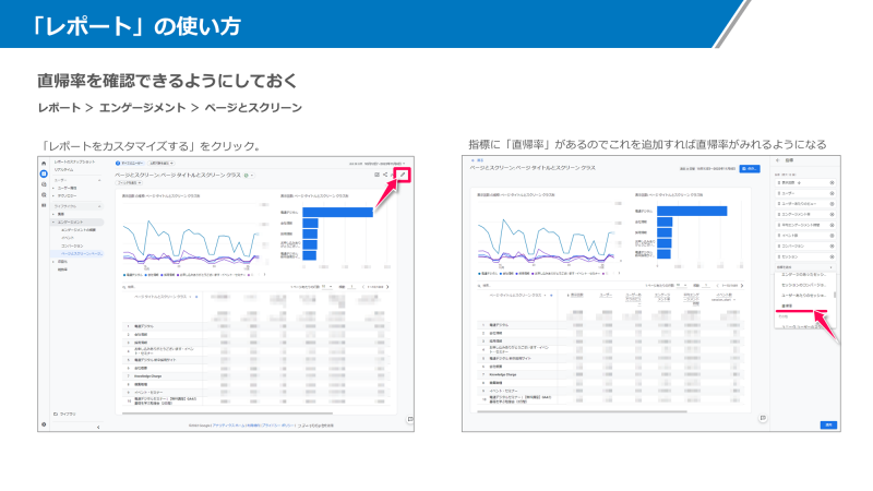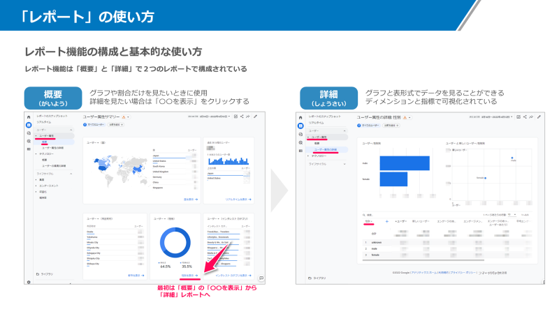 スライド左側が「レポート」です。あらかじめ用意された項目の中から、見たいレポートを選択して、データを確認するという使い方です。主にサイト全体の状況を把握したい場合に利用します。