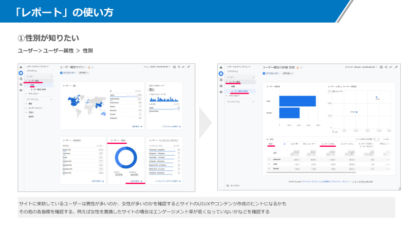 Webサイトに来訪するユーザーは男性と女性のどちらが多いのかを見たいときは、「ユーザー」>「ユーザー属性」>「概要」の「ユーザー(性別)」カードで確認します。カードの右下「性別を表示」をクリックすると、性別の詳細レポートを確認できます。コンバージョンやエンゲージメントを確認して、UI/UXの改善に役立てると良いでしょう。