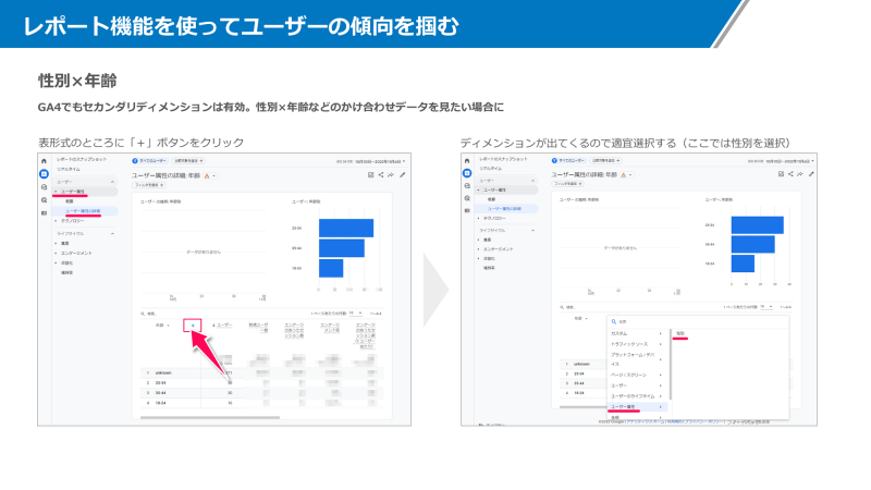 「+」ボタンをクリックすると、ディメンションの候補が出てきます(上図右)。ここで「ユーザー属性」>「性別」を選択すれば、性別×年齢の掛け合わせデータが表示されます。