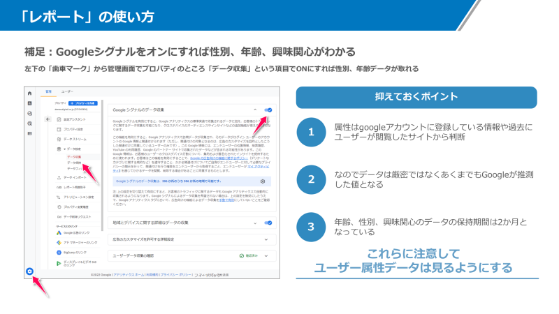 性別、年齢、興味関心のデータを見るには、GoogleシグナルをONにしなくてはなりません。画面左下の「歯車マーク(管理)」>「プロパティ」>「データ設定」>「データ収集」で「Googleシグナルのデータ収集」画面を表示し、GoogleシグナルをONにすれば性別、年齢、興味関心が分かるようになります。