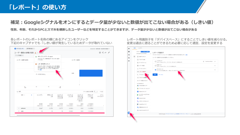 しきい値が出現する可能性を減らすには、「歯車マーク(管理)」>「プロパティ」>「レポート用識別子」という画面で、「デバイスベース」を選択します(可能性が減るだけで、まったく出現しなくなるわけではありません)。変更は過去にさかのぼって反映されます。必要に応じて適宜、設定を変えましょう。