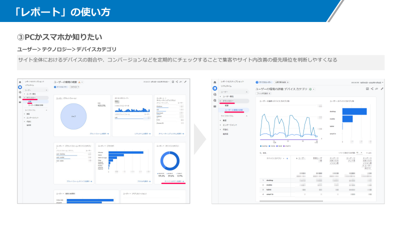 サイト全体におけるデバイスの割合や、コンバージョンなどを定期的にチェックすることで、集客やサイト内改善の優先順位を判断しやすくなります。