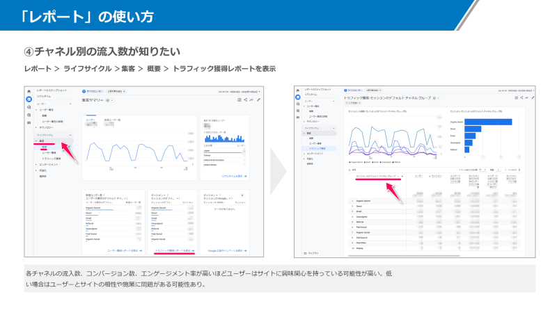 ユーザーが自然検索から来ているのか、広告から来ているのか、チャネル別の流入数を調べるには、「集客」>「概要」>「トラフィック獲得レポートを表示」(または「集客」>「トラフィック獲得」)をクリックし、「トラフィック獲得」レポート(下図右)を確認します。