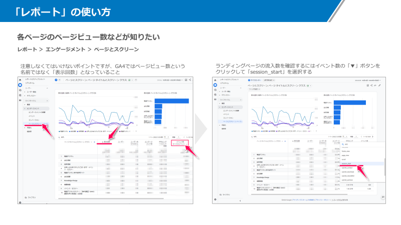 「ページとスクリーン」レポート(上図左)の表形式の右の方にある「イベント数」という指標が「すべてのイベント」になっています。ここで「▼」ボタンをクリックし(上図右)、「session_start」を選択すれば、ランディングページの流入数を確認することができます。これはかなり使えるので覚えておきましょう。