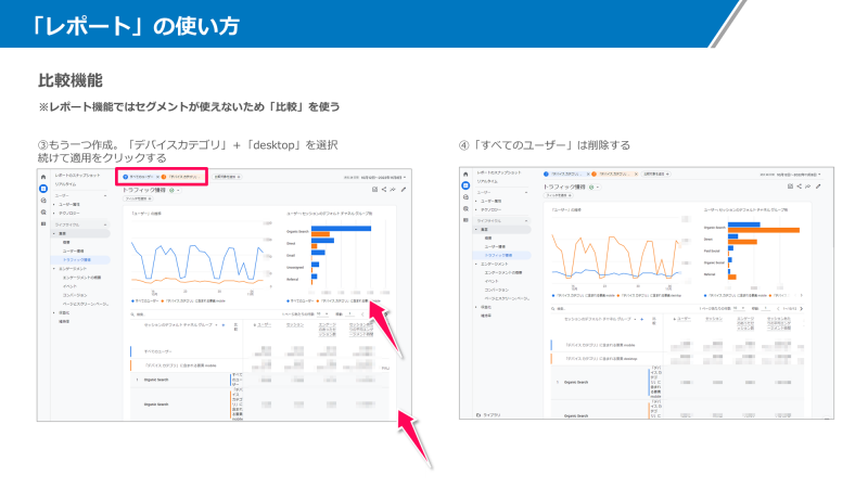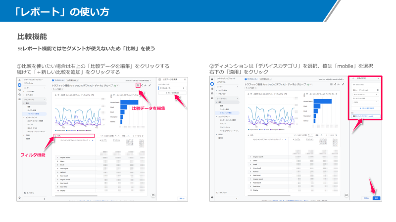 レポートではセグメントが使えません。データを特定の条件で絞り込んで比較したいときは、「比較」という機能を使います。