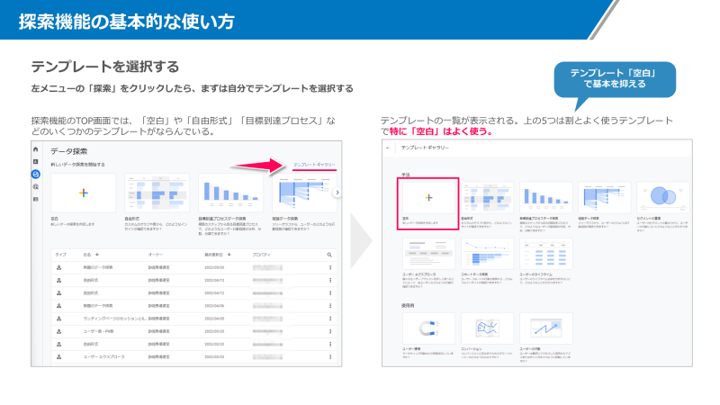 さまざまなテンプレートがありますが、なかでも「空白」はよく使いますので、「空白」をベースにして、「探索」の方法を解説します。