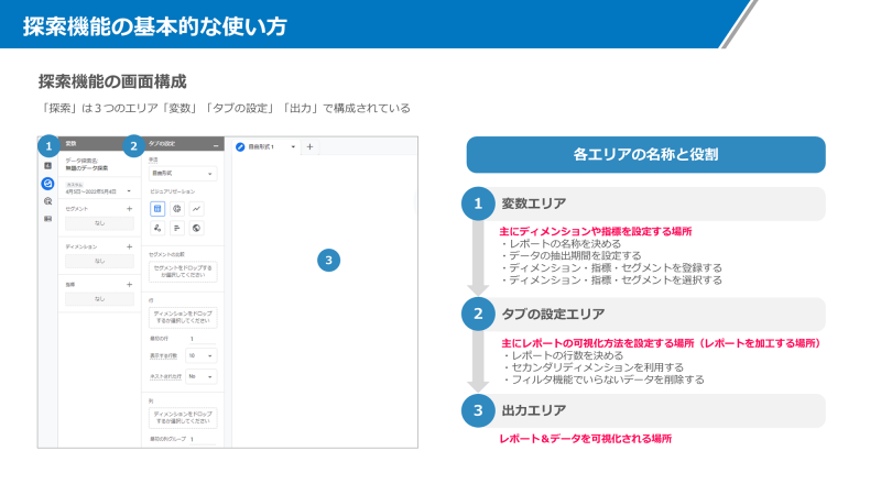 「探索」は3つのエリア「変数」「タブの設定」「出力」で構成されています。