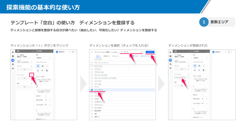 まずは「変数」エリアでディメンションを登録します。ディメンションとは「切り口」のことです。例えば「デバイスごとのユーザー数」が見たい場合、「デバイスごと」「チャネルごと」などがディメンションにあたります。